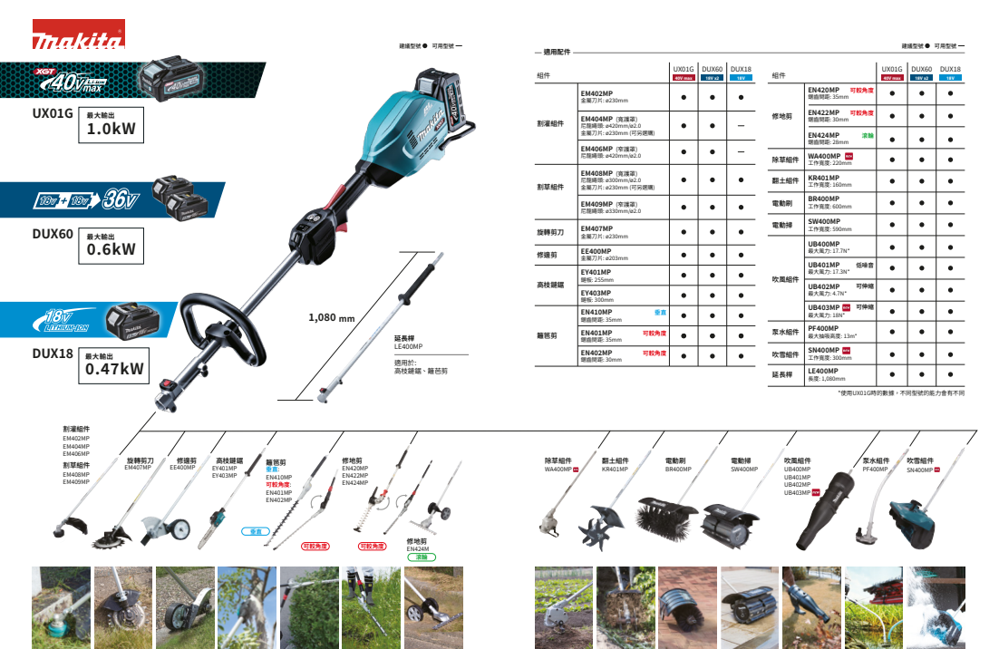 - 能接駁多款工具頭,包括剪草、高枝剪、籬笆剪、翻土器等