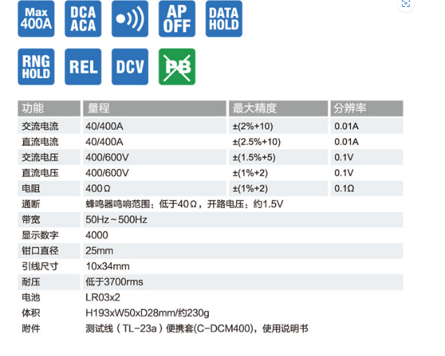 ■ 最大可測量交直流電流400A , 最高解析度0.01A