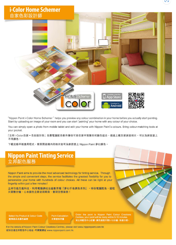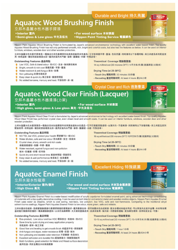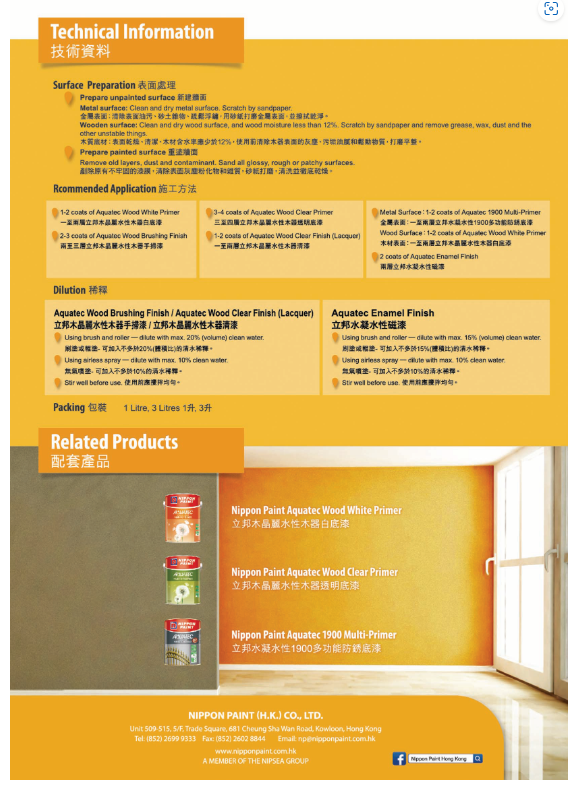 立邦水性木器手掃漆是一種集合日本先進環保科技與高效能的水性產品。它不但漆膜平滑、豐滿,色彩亮麗,同時擁有以下各種特點,與立邦產品系列配套使用,相得益彰,讓您的居室增添光彩。適用於室內木門窗、傢俱、護牆板、木線、竹製品等。它同時具有電腦調色功能,可於全港九各立邦配色中心內選擇自己喜愛的顏色,色彩自由mix & match。