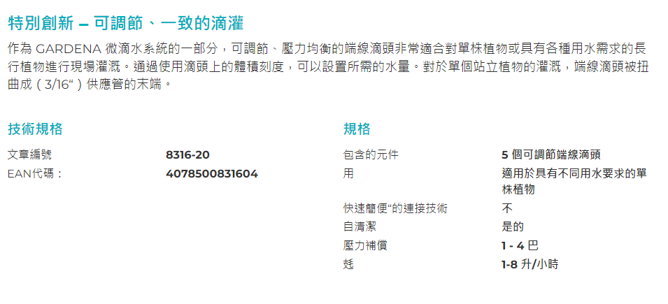 "GARDENA" 德國1-8L/h流量精準灌溉可調穩壓滴頭(平均水壓至1-4bar)(斜坡/垂直種植)(10包/盒)(5個/包)-[8316]