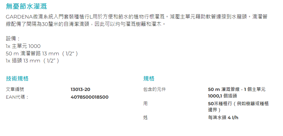 "GARDENA" 德國1/2"x50m地面有孔滴灌套裝(30cm孔距-4L/h流量)(1套/盒)-[13013]