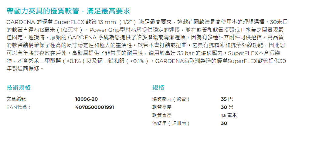 "GARDENA" 德國13mm(1/2")X30m Premium SuperFLEX 橙色花園喉-[18096]