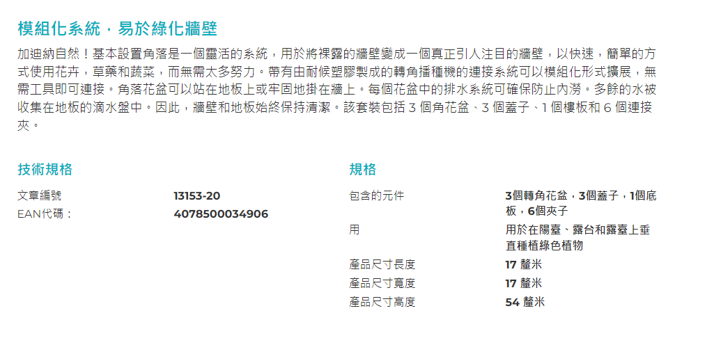"GARDENA" 德國17x17x54cm墻角位家用垂直種植套裝(3個盆栽)(1套/盒)-[13153]