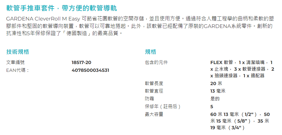 "GARDENA" 德國4分X20m喉喉架套M(帶滑輪)(1套/盒)-[18517]