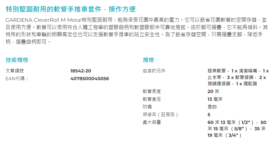 "GARDENA" 德國20m4分喉喉架套裝M(半金屬)(2套/盒)-[18542]