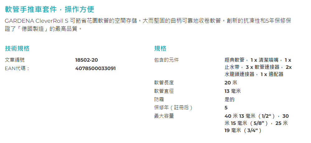 "GARDENA" 德國4分X20m喉架套裝S(18套/盒)-[18502-20]
