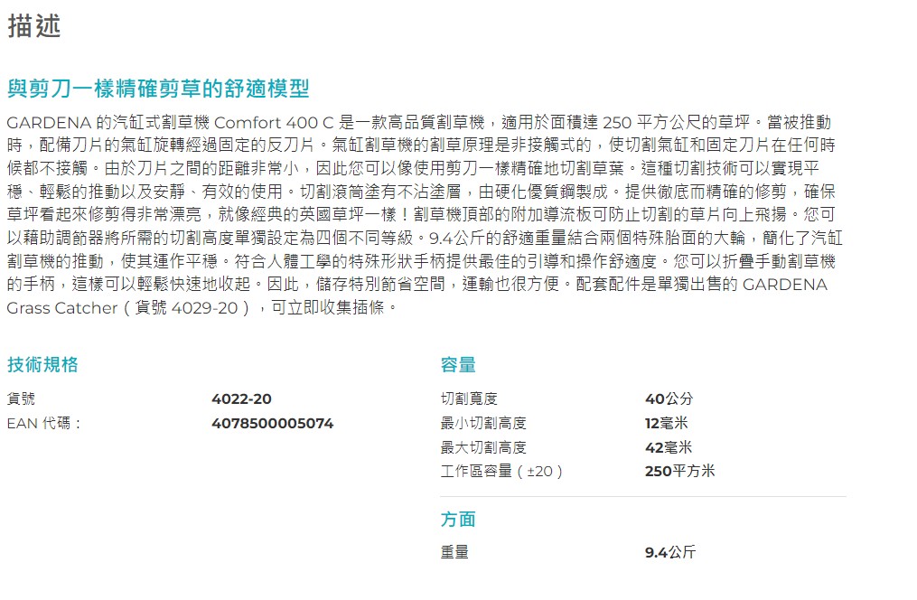 "GARDENA" 德國250㎡滾筒式剪草機Comfort400C