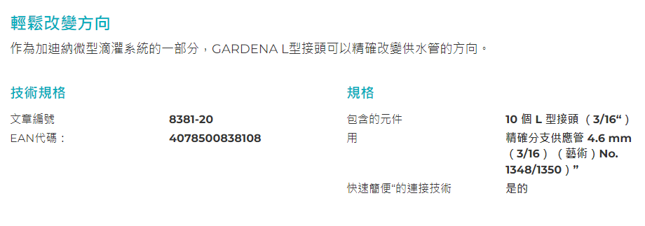 "GARDENA" 德國3/16"(4.6mm)L型接頭(10包/盒)(10個/包)-[8381]