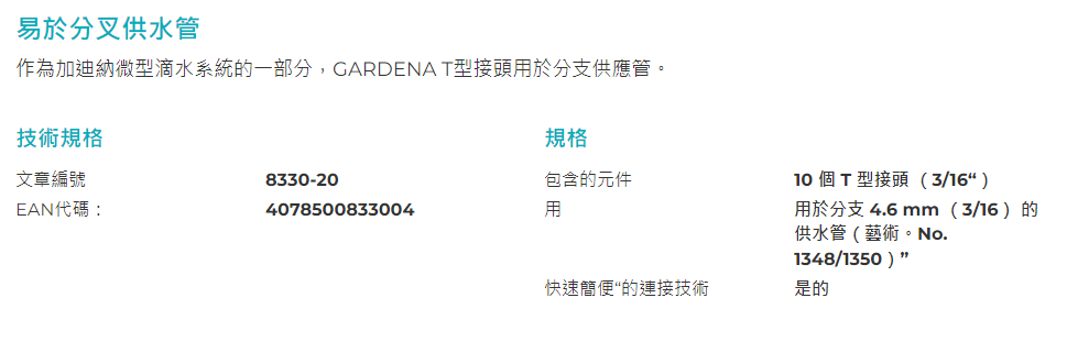 "GARDENA" 德國3/16"(4.6mm)T型接頭(10包/盒)(10個/包)-[8330]