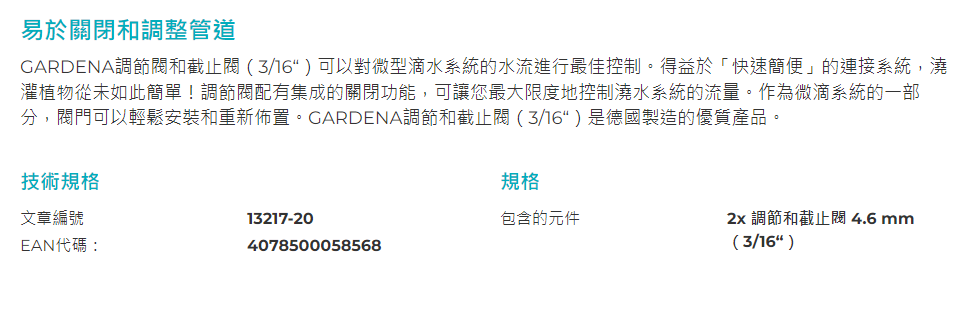 "GARDENA" 德國3/16"(4.6mm)水量調節閥(10包/盒)(2個/包)-[13217]