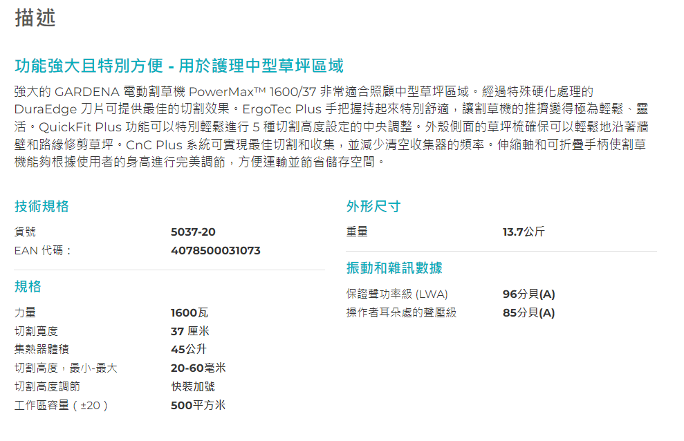 "GARDENA" 德國500㎡電動式剪草車