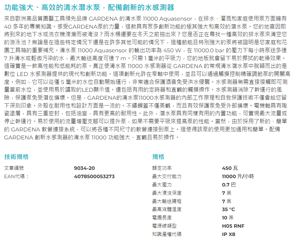 "GARDENA" 德國7m揚程清水觸控潛水泵(壓力感應式開關)-[9034]