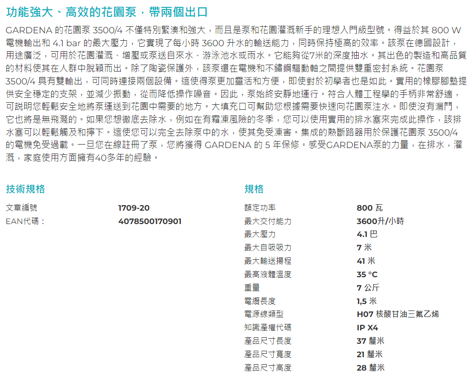 "GARDENA" 德國41m揚程射流增壓水泵-[1709]