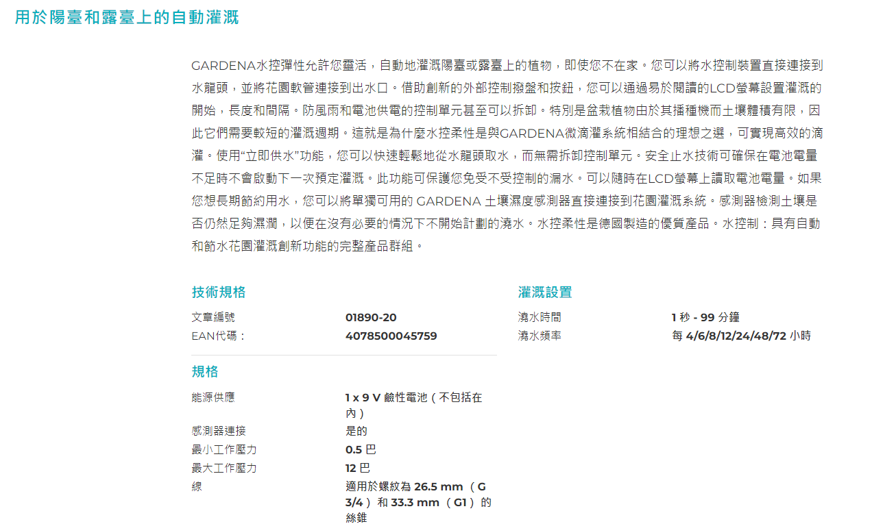"GARDENA" 德國智能控制器Flex 1s-99min灌溉時長(1x9V鹼性電池)(2個/盒)-[1890]