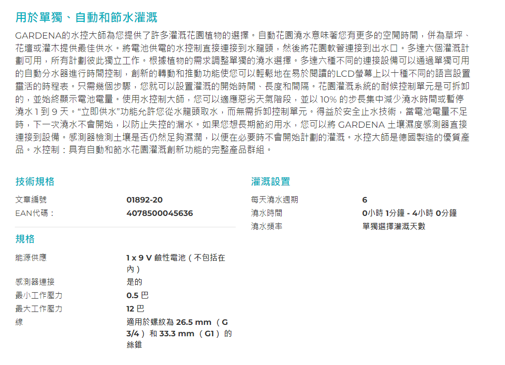 "GARDENA" 德國智能控制器Master 1min-4h灌溉時長(1x9V鹼性電池)(2個/盒)-[1892]