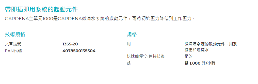 "GARDENA" 德國水壓穩定器(最大流量1000L/h)(將外部水壓降至1.5Bar)(1/2"&3/16"主管/毛管通用)(5個/盒)-[1355]
