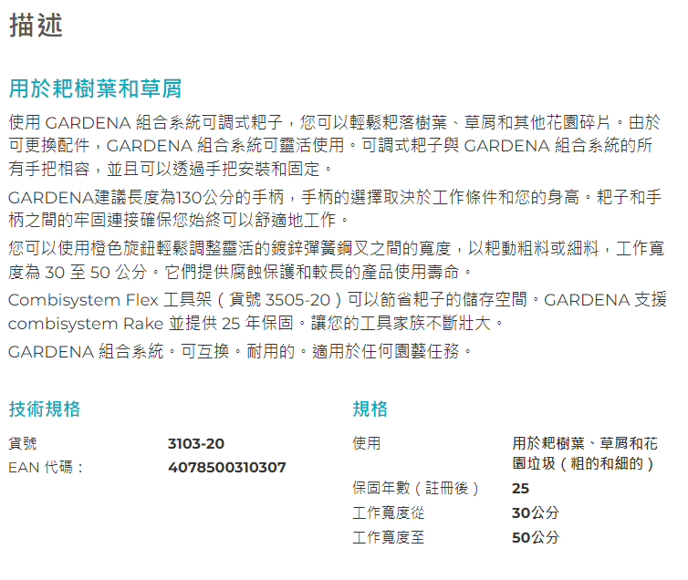 "GARDENA" 德國組合式合金細齒草耙耙頭(30-50cm工作寬度)(5個/盒)-[3103]