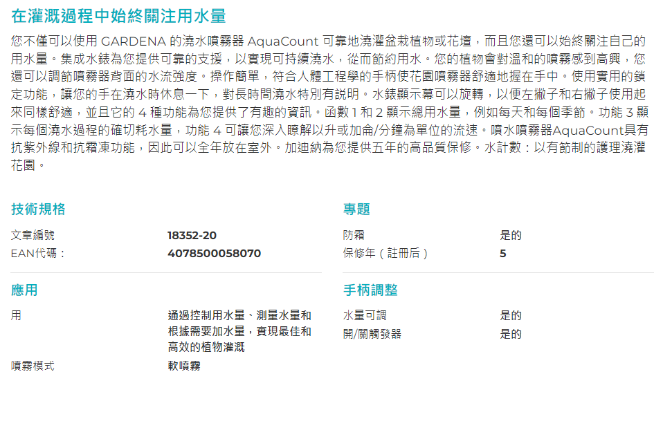 "GARDENA" 德國花灑水槍帶水量計流器(1功能)(彩盒裝)(4個/盒)-[18352]