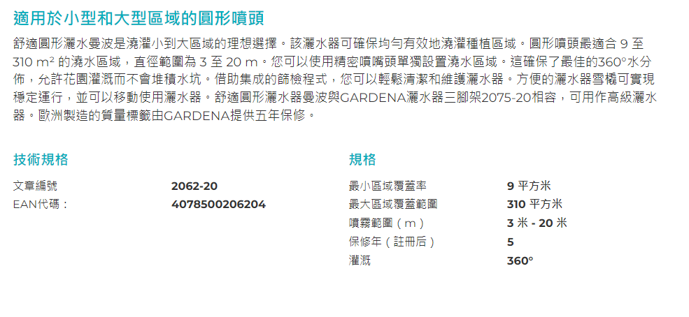 "GARDENA" 德國豪華款坐地式/360°旋轉灑水器(可調節噴灑範圍)(射程:3-20m,9-310㎡)(4個/盒)-[2062]