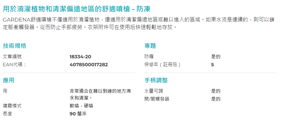 "GARDENA" 德國豪華款活動長柄水槍(2功能)(彩色卡紙裝)(6個/盒)-[18334]