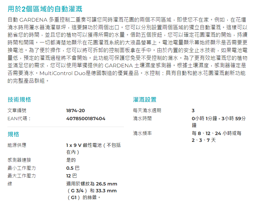 "GARDENA" 德國雙出水位智能控制器 1min-3h59min灌溉時長(1x9V鹼性電池)(2個/盒)-[1874]