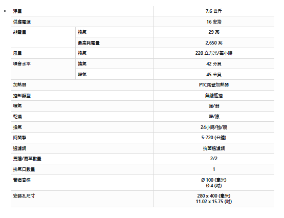 | 風量 | 換氣 | 220 立方米/每小時 |