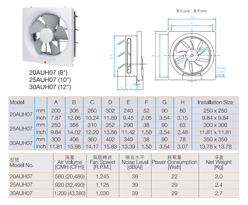| 30AUH07, 30ALF07 | 掛牆式 | 350 x 350 (方孔) | ≧500 x 500 |