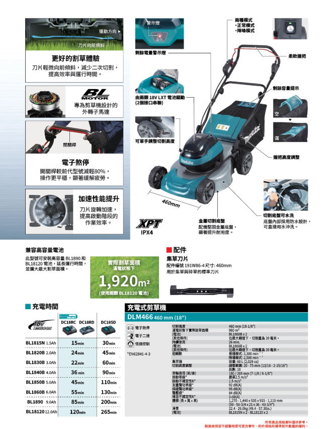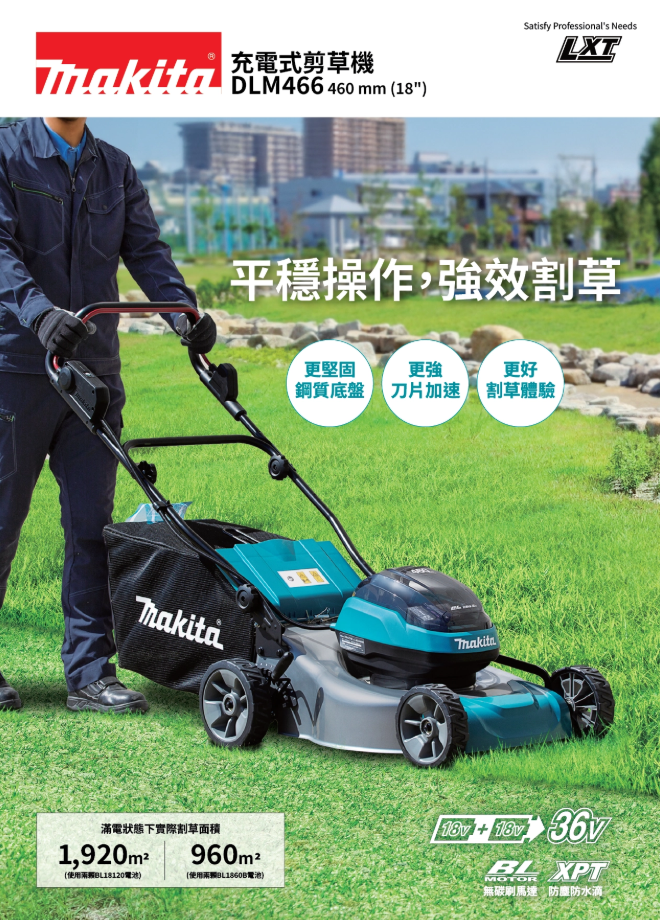 - 使用兩顆 18V LXT 電池(BL1860B)可割草面積達 900 m² 。