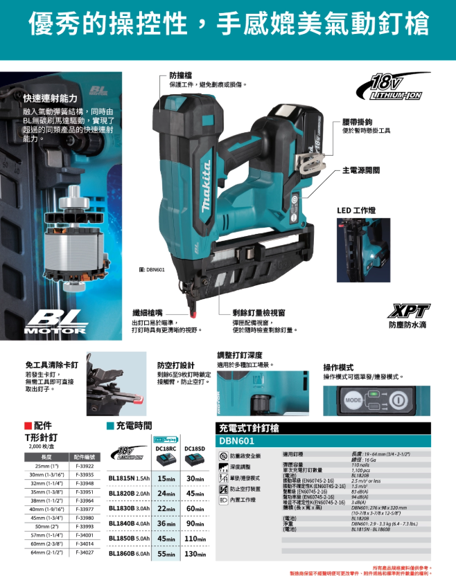 - 18V LXT Li-Ion 無線 16 Ga 64 mm (2-1/2") T針釘槍