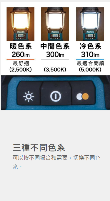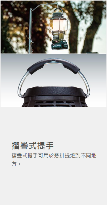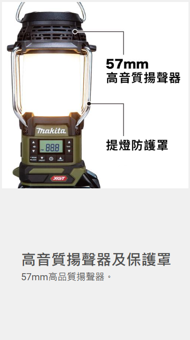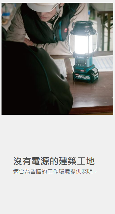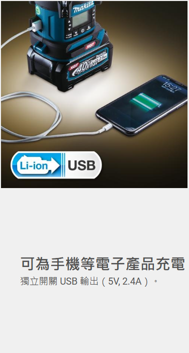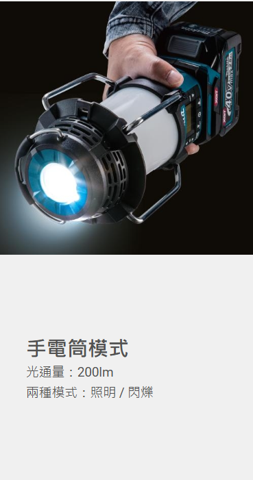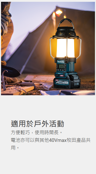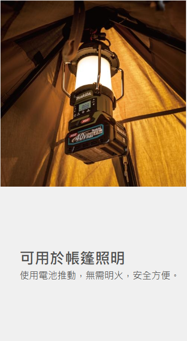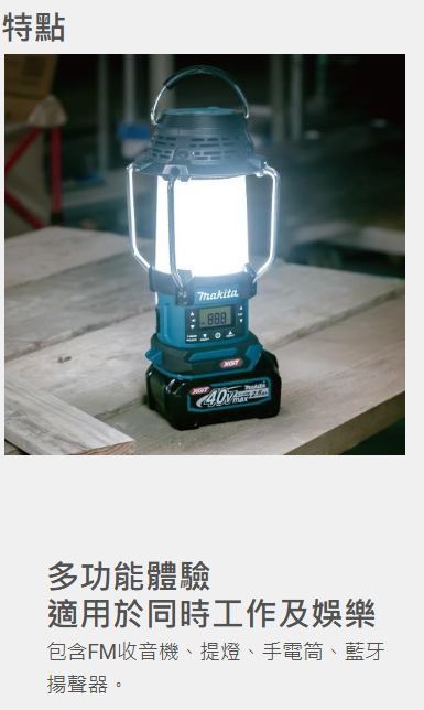 - 40V 4.0Ah 電池使用時間 (收音機 41h ; 手電筒 46-86h ; 提燈 24-33h ; 收音機+提燈 15h)