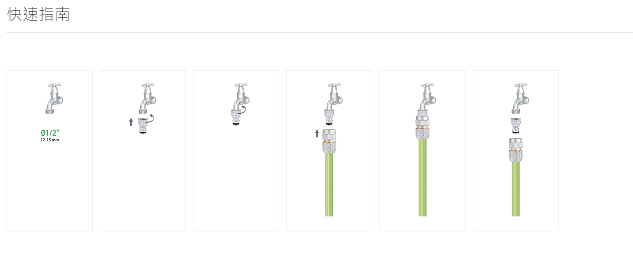 水龍頭連接器。用於將自動接頭連接至水龍頭。1/2” (15 - 21 mm) 內螺紋。