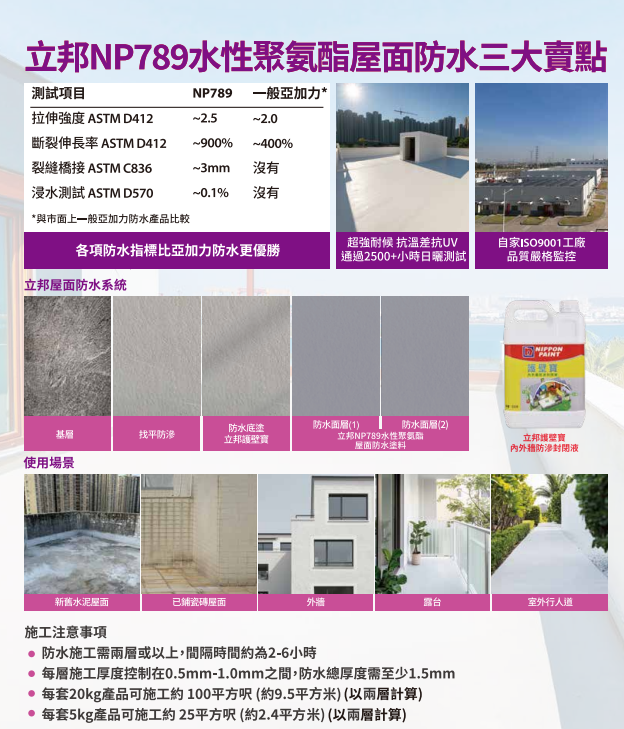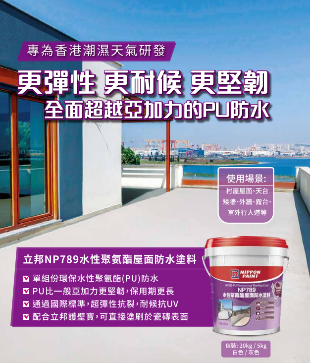立邦NP789水性聚氨酯屋面防水塗料是由環保水性PU乳液、功能性填料及助劑調配而成的單組份面層防水塗料。此產品專為香港潮濕環境研發,具備超持久的防水效果、高彈抗裂性能、耐候隔熱、低吸水率等特點,並且符合水性環保標準;適用於室內外的防水防潮處理。