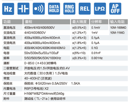 ■ 具有交直流電壓、交直流電流、通斷、電阻、二極體檢測以及頻率檢測(僅限於零交叉信號,輸入電阻約2KΩ)